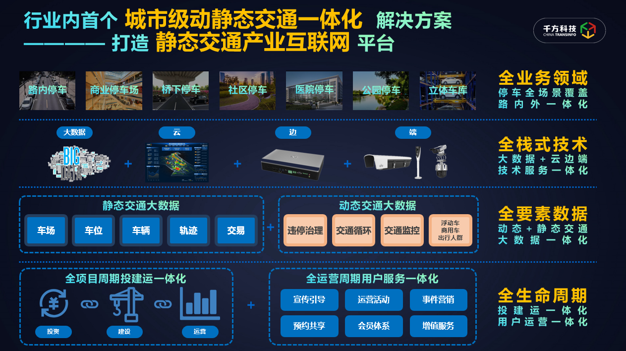 本次大会尊龙卡Z6科技还发布了行业首个城市级动静态交通一体化解决方案。该解决方案是尊龙卡Z6科技Omni-T全域交通解决方案 “四全”关键要素的全面落地,可实现路内路外停车场景全覆盖,包含路内停车、商业场所、桥下停车、社区停车、医院停车、公共停车、地下车库等;依托大数据+云边端融合的全栈式技术、动静态一体化的全要素数据,实施投建运一体化、用户运营一体化的全生命周期服务。该方案是业内首次将动态交通数据应用于静态交通综合治理,并通过打造静态交通产业互联网平台实现客户价值倍增。